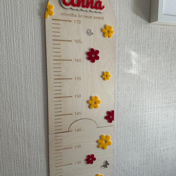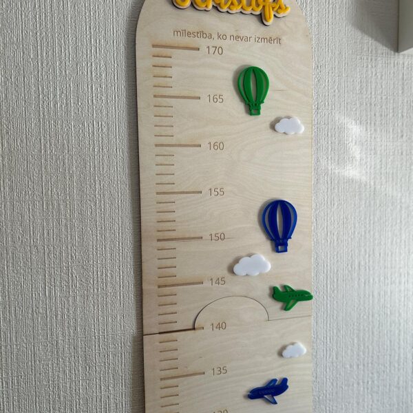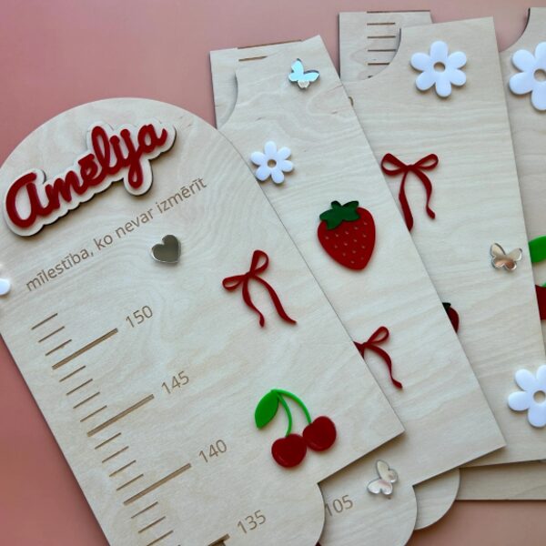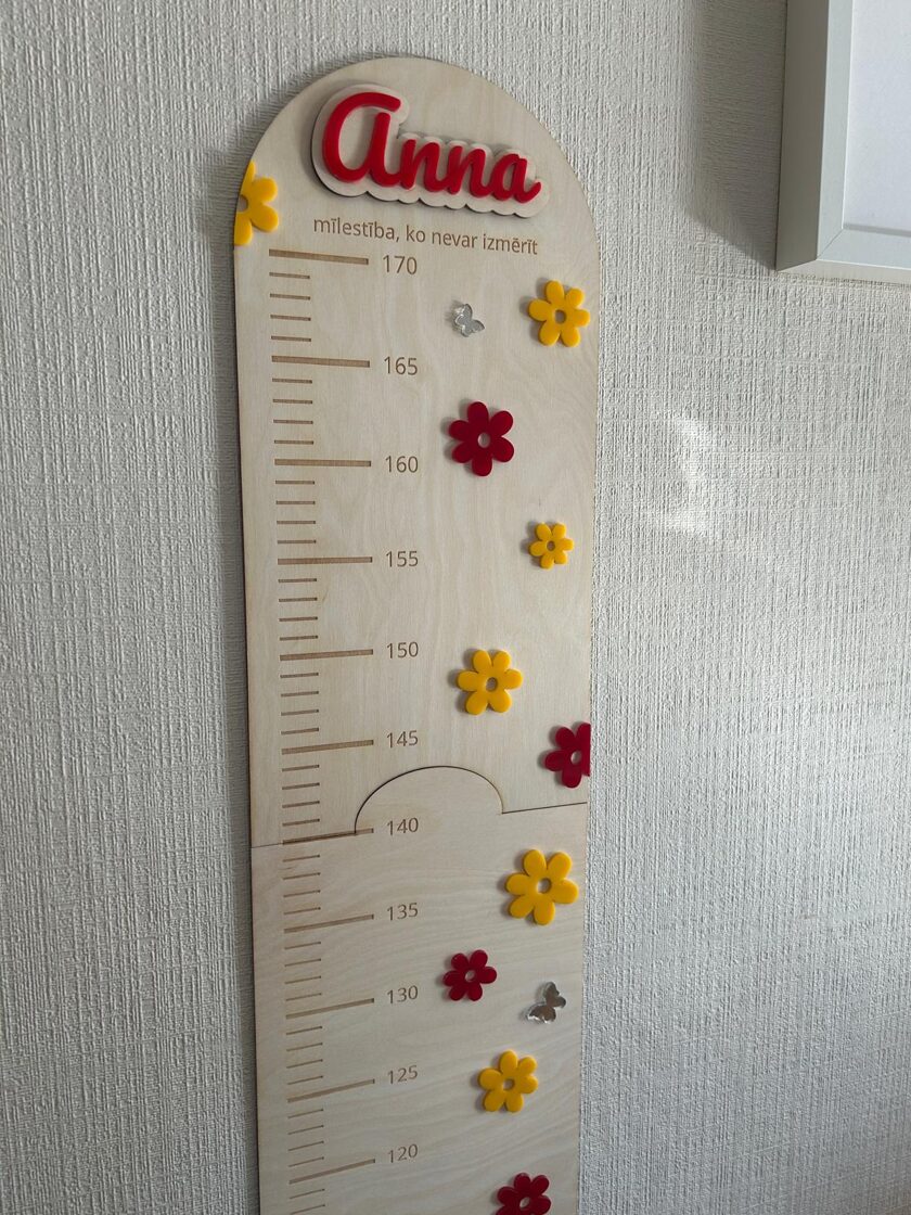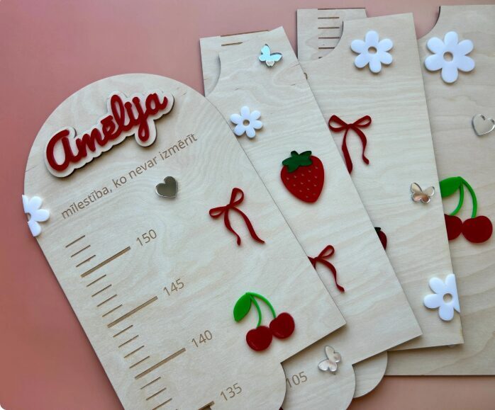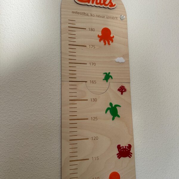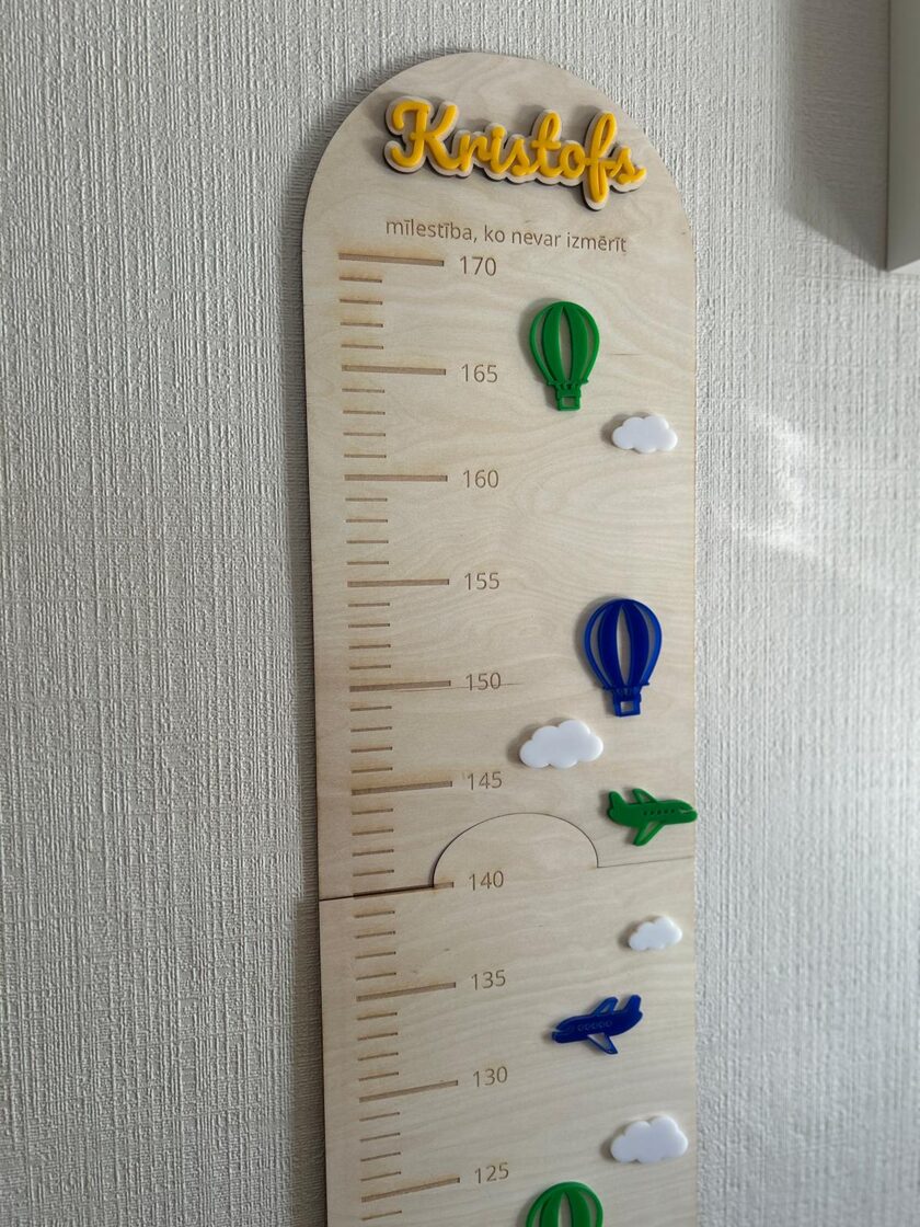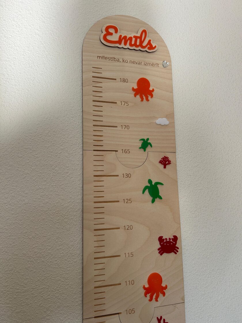 Iemūžini sava bērna augšanas mirkļus ar skaistu un praktisku koka auguma lineālu. Tas ir ne tikai precīzs auguma mērītājs, bet arī stilīgs interjera elements bērna istabai. Auguma lineāls izgatavots no 3 mm bieza finiera, papildināts ar organiskā stikla (akrila) dekoratīvajām detaļām, kas piešķir dizainam krāsu, dzīvīgumu un modernu izskatu. Tas ir rūpīgi apstrādāts ar precīzi iegravētu skalu un personalizācijas iespējām.